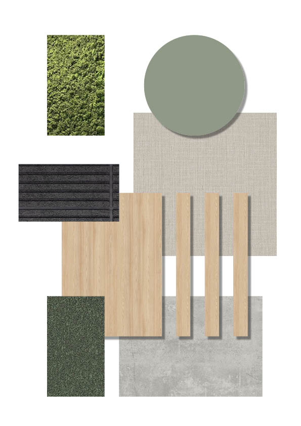 De entreehal is één van de visitekaartjes van het nieuwe bedrijfspand. Hier zie je een mos wand, die een natuurlijke uitstraling geeft en bijdraagt aan een aangenaam binnenklimaat. In deze groene wand zijn houten kozijnen geïntegreerd die zorgen voor een warme sfeer en is het bedrijfslogo, uitgevoerd in strakke witte letters, verwerkt. De linkerwand heeft dezelfde lagenstructuur als de buitengevels, wat zorgt voor een consistente en hoogwaardige uitstraling van binnen naar buiten.