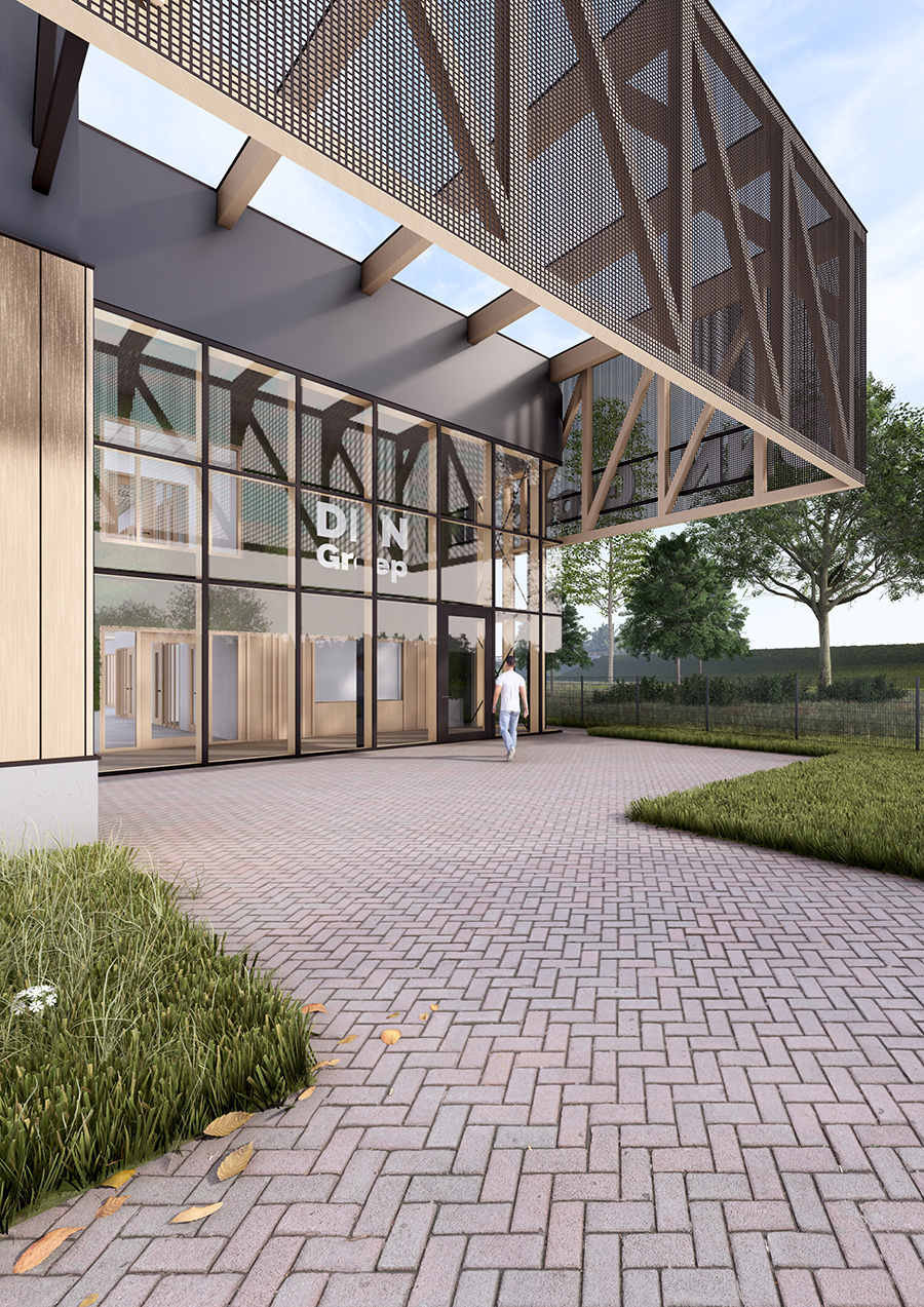 Het uitgangspunt voor het ontwerp is helder: een gebouw dat praktisch en efficiënt functioneert én dat tegelijk de ambities en de kracht van DNN Groep presenteert. De massaopbouw van de nieuwbouw volgt de lijn van het perceel en de snelweg A37, wat zorgt voor een sterke zichtbaarheid op deze A-locatie aan de rand van Emmen. De drie functies – kantoor, opslaghal en productiehal – hebben ieder hun eigen herkenbare volume en hoogte gekregen. Een doorlopende luifel verbindt deze volumes en zorgt voor een krachtig geheel. Bovendien ontstaat er door de luifel ruimte voor een dakterras, waar demonstraties en presentaties kunnen plaatsvinden. De gevel krijgt een robuuste, betonnen plint welke gecombineerd wordt met hout en staal. Dit geeft het pand een warme en moderne uitstraling, die aansluit bij de visie van de DNN Groep.